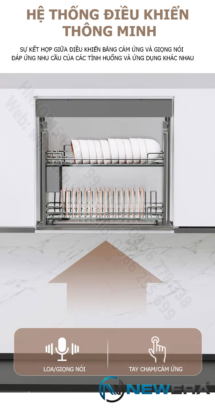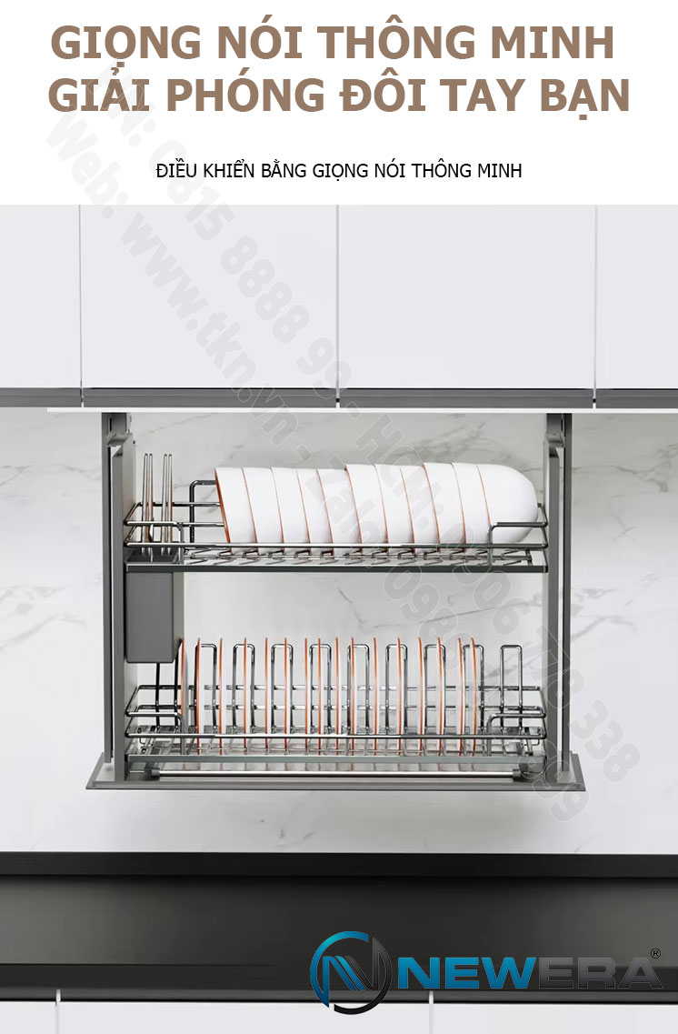 Tự Động Hóa Tuyệt Đối: Chỉ với một chạm, giá bát sẽ di chuyển êm ái xuống tầm tay bạn. Tính năng Tự Động Thu Gọn thông minh sẽ kích hoạt, nhẹ nhàng đưa giá bát trở lại vị trí âm tủ sau 15 phút không sử dụng, giữ cho căn bếp luôn gọn gàng và tinh tế như một khách sạn 5 sao.