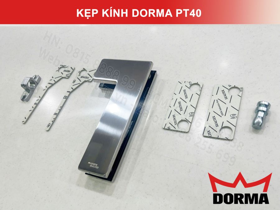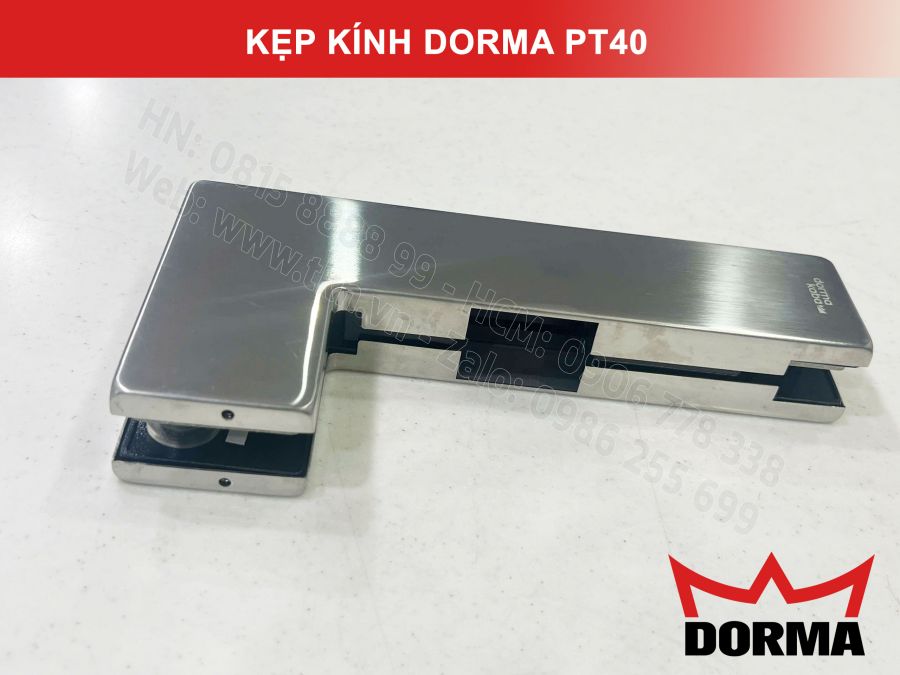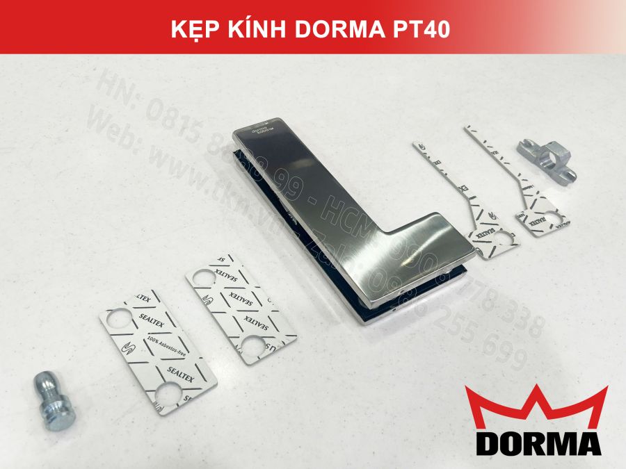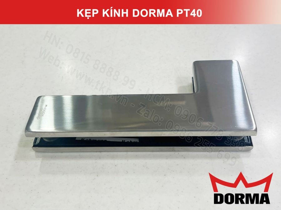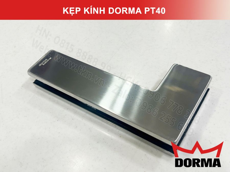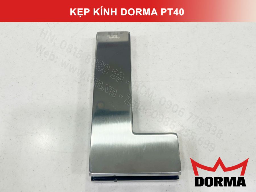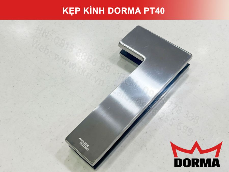 Kẹp kính Dorma PT40 được chế tác từ inox 304 cao cấp, là một trong những phụ kiện quan trọng nhất cho cửa kính thủy lực. Sản phẩm này có thiết kế hình chữ L đặc trưng với chiều dài 218mm, trọng lượng 0.928kg, được lắp đặt ở phía trên cánh cửa, đóng vai trò kết nối và cố định cánh cửa với khung hoặc vách kính.